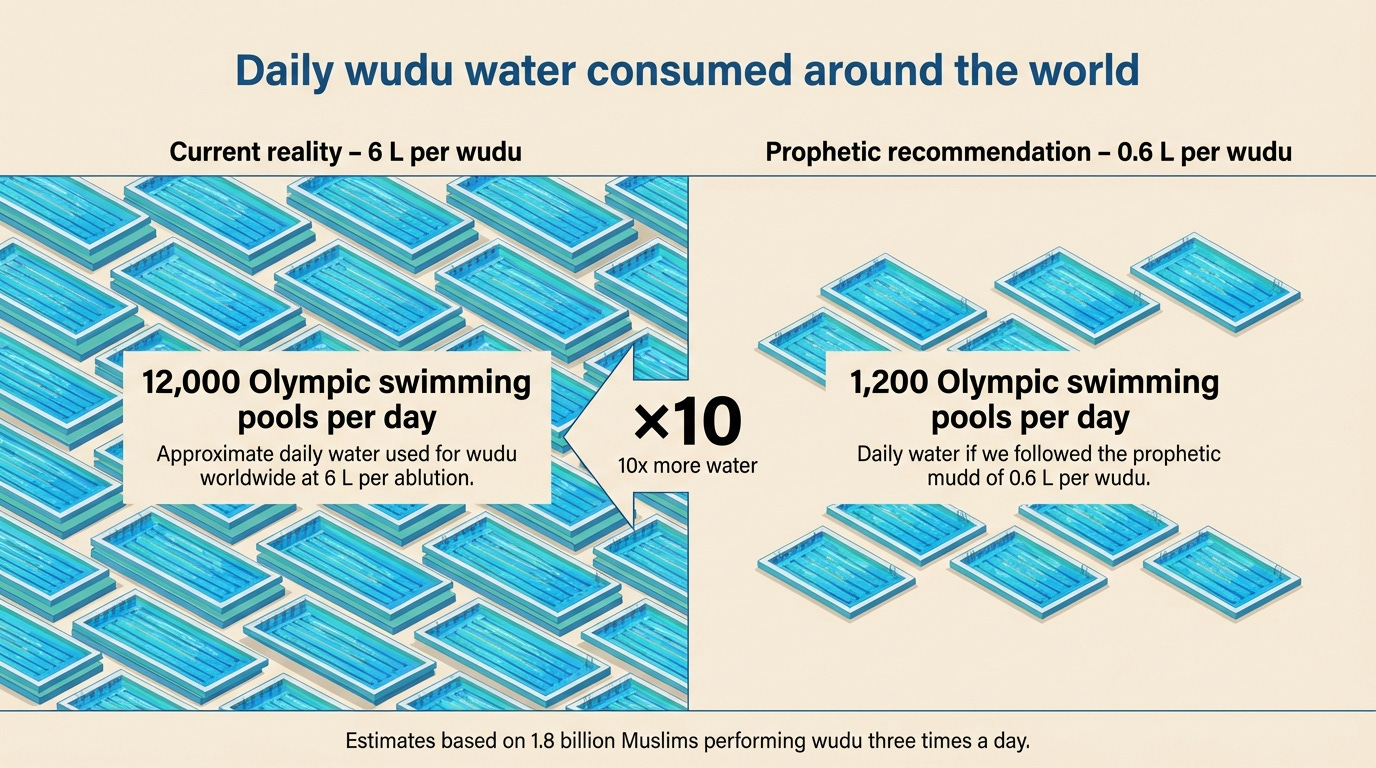 There are 1.8 billion Muslims in the world, and most perform wudu at least three times a day. At the prophetic minimum of 0.6 liters per ablution, that is over 3 billion liters of water used for wudu alone, every single day. But in the previous article we found that most people use, on average, 10x more water, meaning 30 billion liters of water!